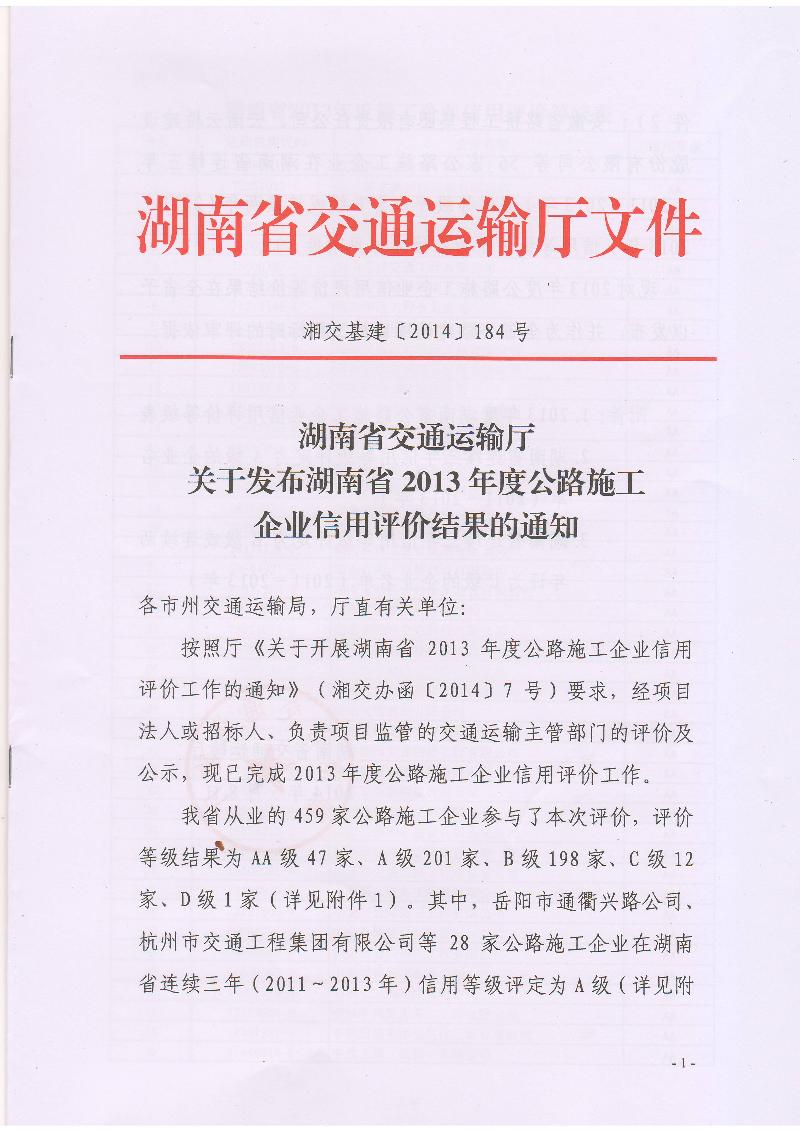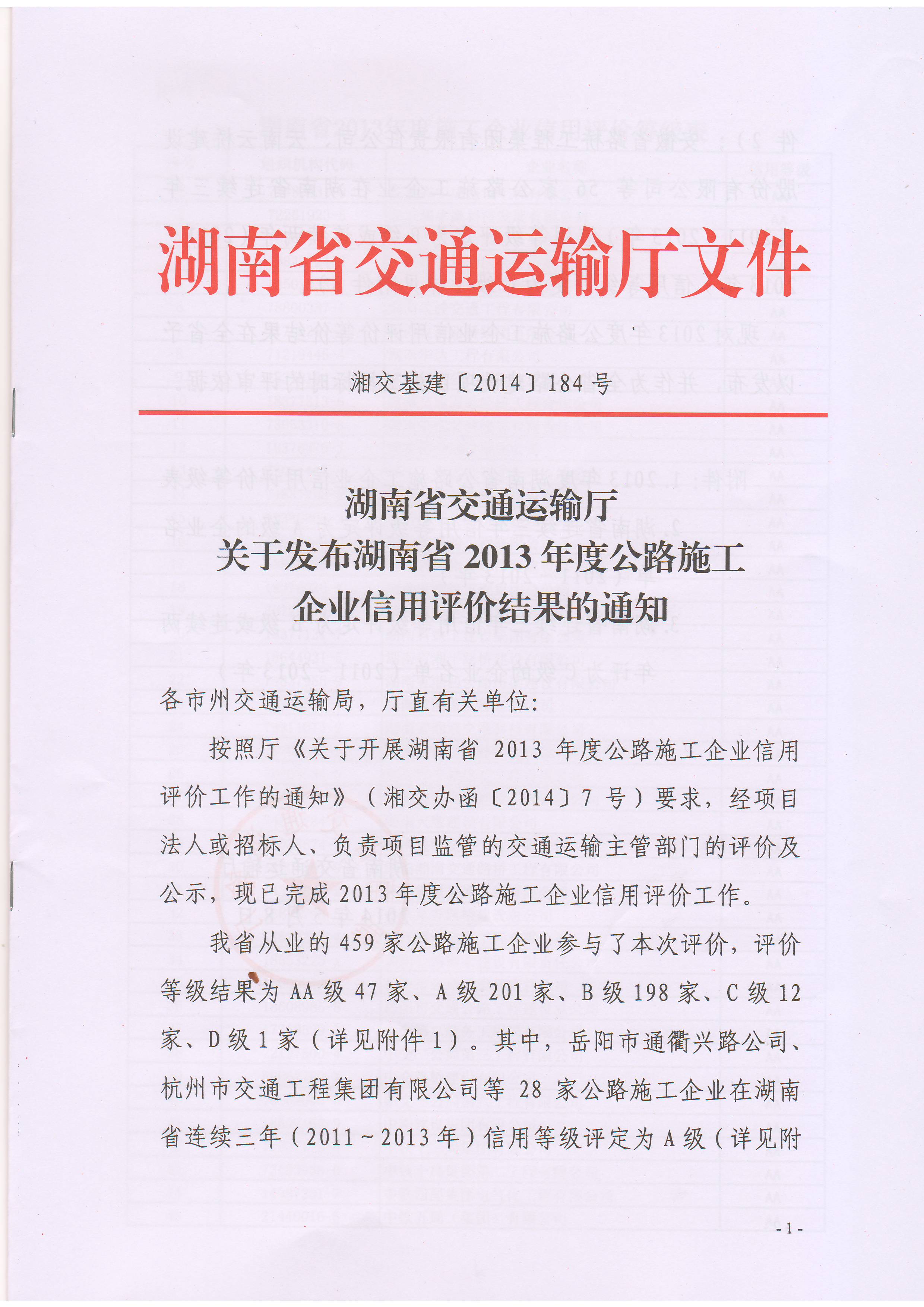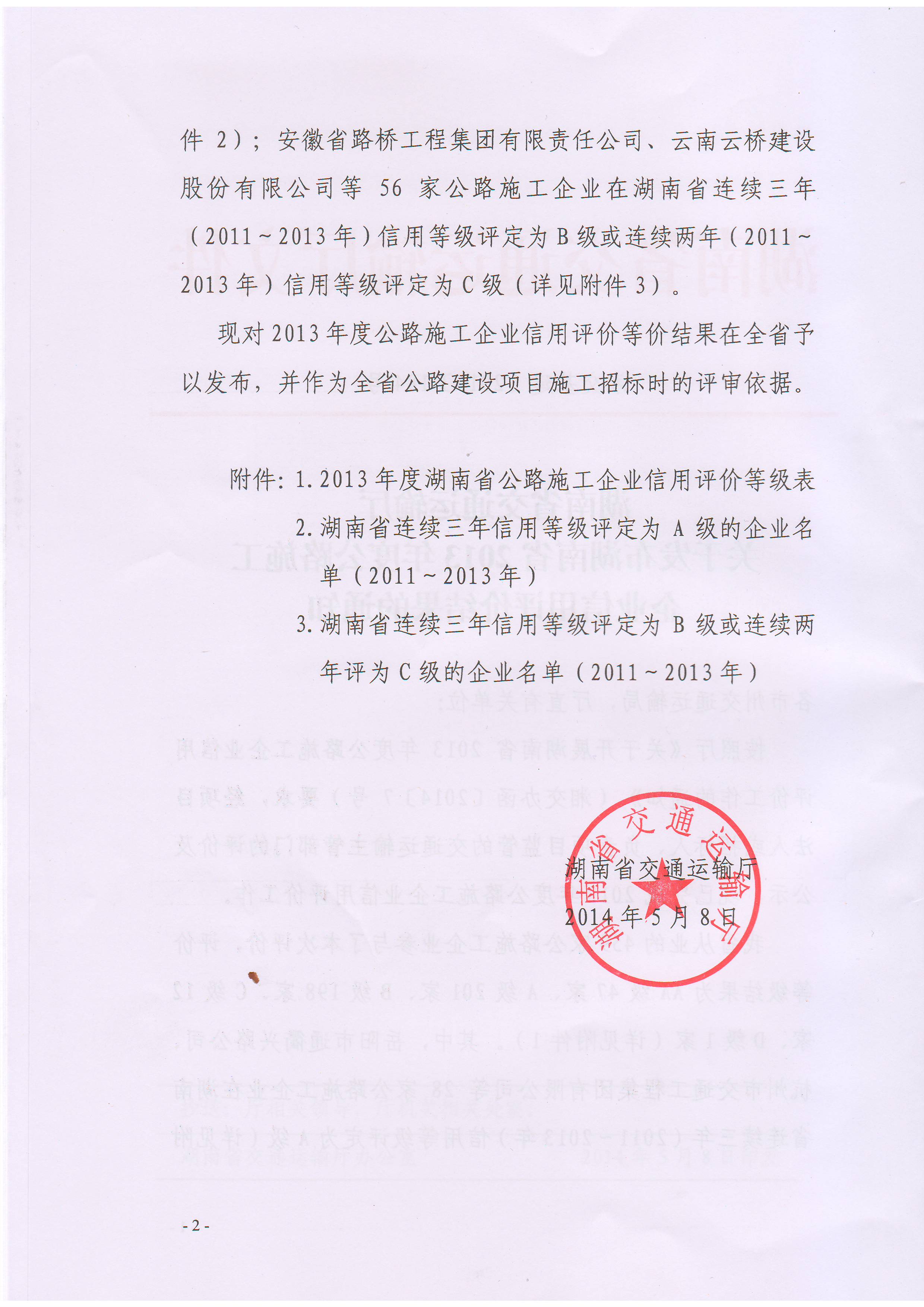 湖南省交通运输厅关于发布湖南省2013年度公路施工企业信用评价结果的通知