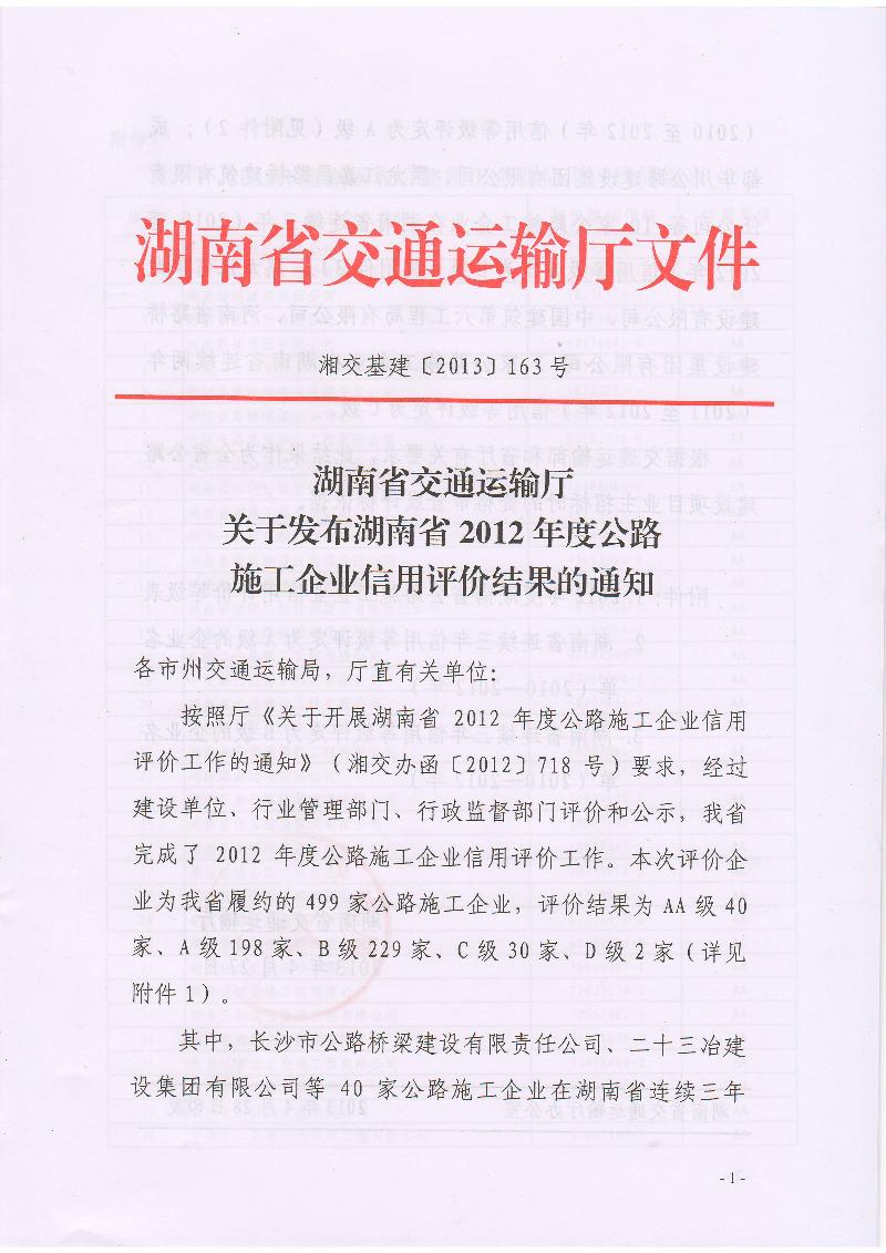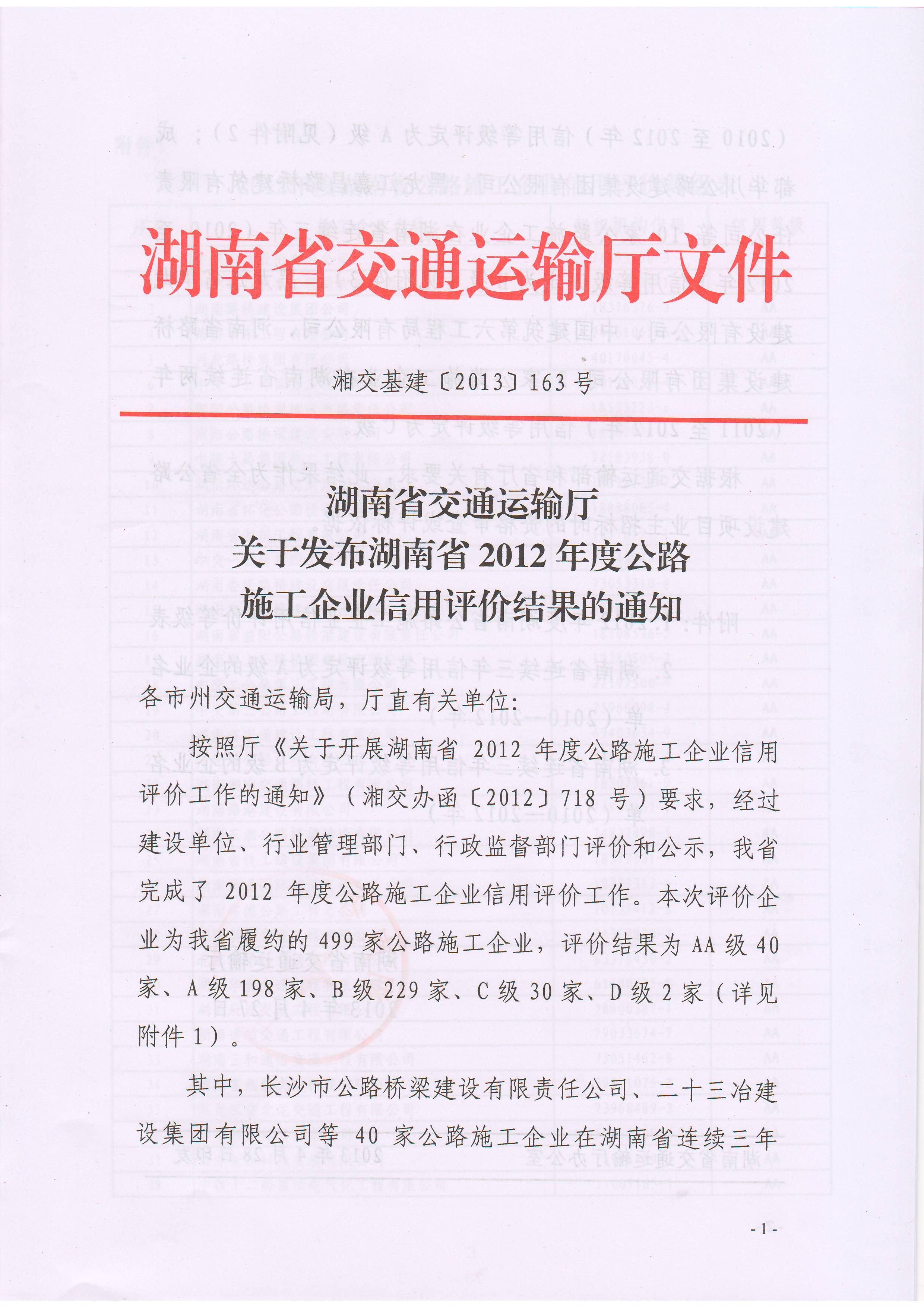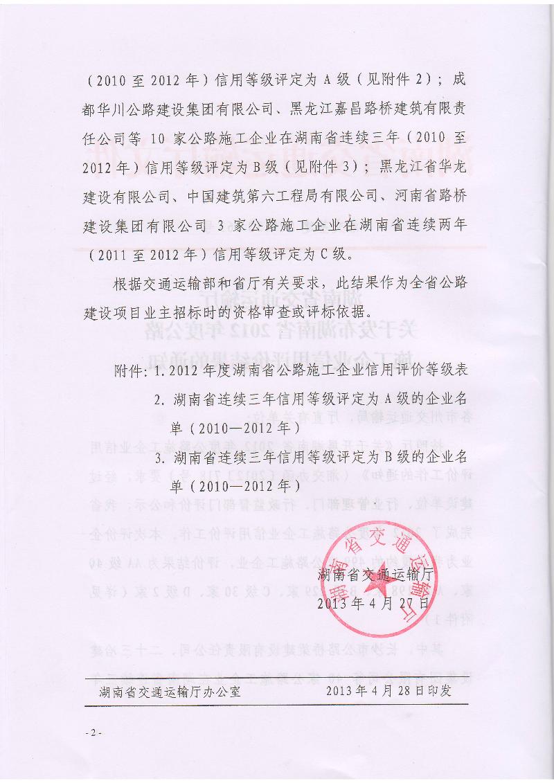 湖南省交通运输厅关于发布湖南省2012年度公路施工企业信用评价结果的通知