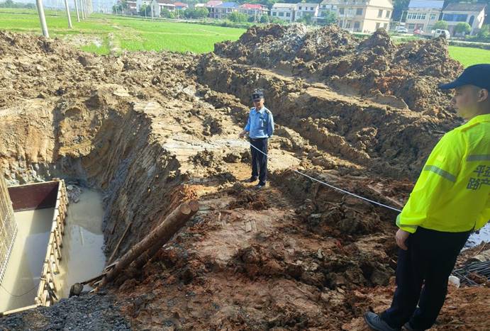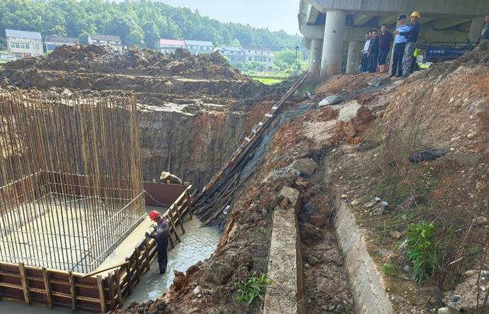 当日上午8时30分,二中队接到平益高速路产养护大队抄告的紧急信息:一企业涉嫌在未取得行政许可的情况下,在平益高速K109+920公路桥梁两侧(距公路水沟外缘仅3.8米处)违规开挖基沟,拟建设电网承台并穿越桥梁埋设电缆。执法人员火速赶赴现场,经勘查发现,东往西侧基坑已预埋钢筋并安装模板,承台尺寸为长宽各5.5米、高1米;西往东侧基坑深达5米,底部渗水严重,存在路基沉降、桥梁结构受损风险。执法人员当即责令施工现场负责人许某停工,告知其行为违反了《中华人民共和国公路法》《公路安全保护条例》相关规定,严重危及高速公路桥梁安全。