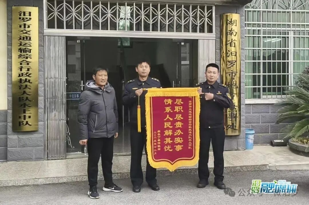 12月23日,汨罗市交通运输综合行政执法大队水上中队收到一面来自山东籍船长的锦旗,感谢执法人员在船只夜间遇险时的迅速救援与妥善处置。