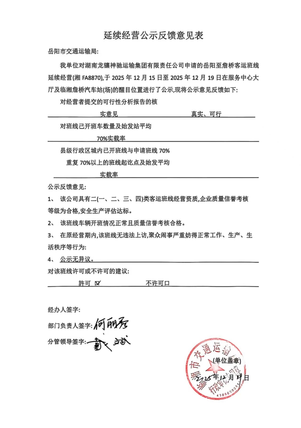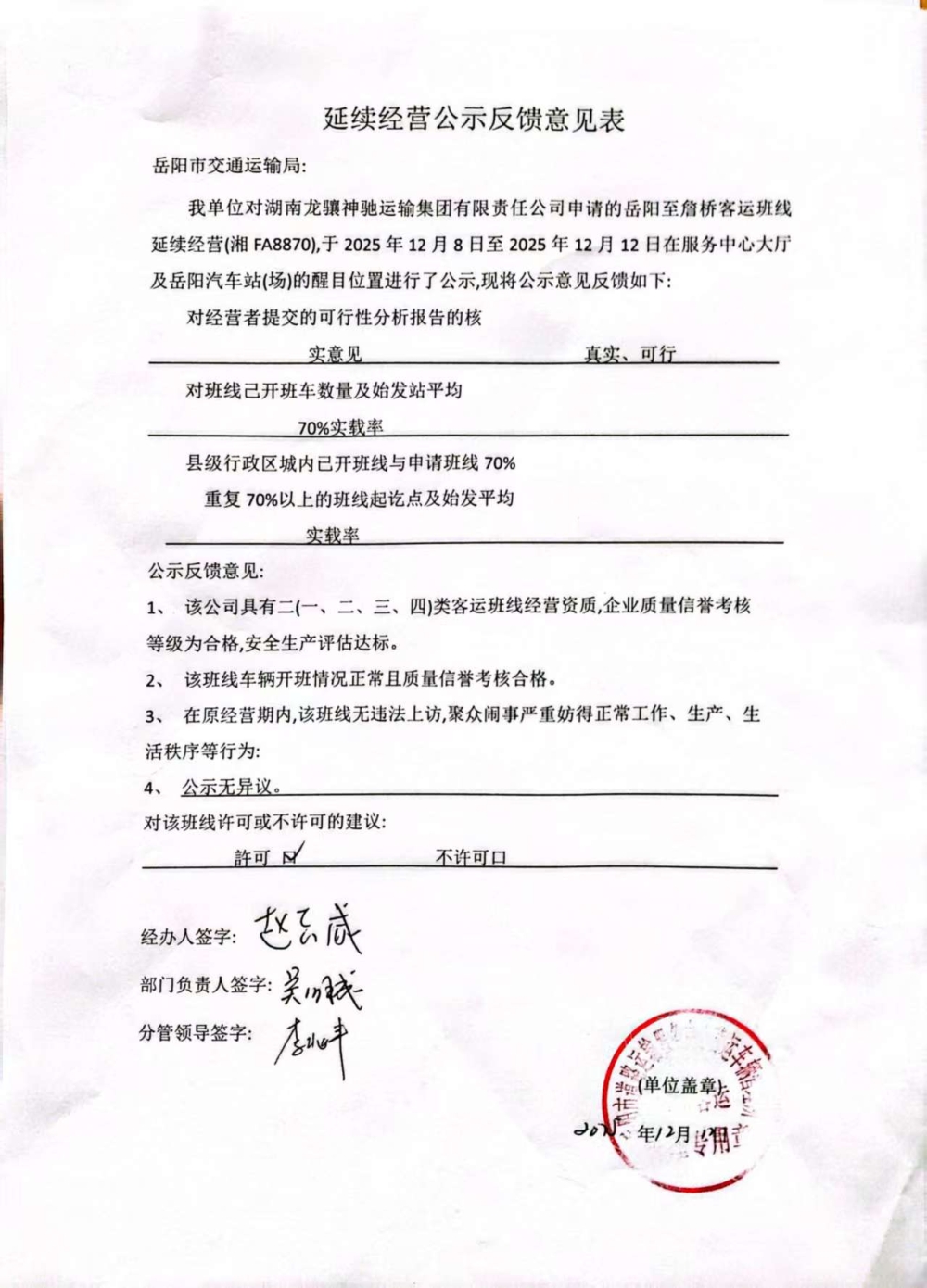 关于湖南龙骧神驰运输集团有限责任公司詹桥班线延续经营的公示