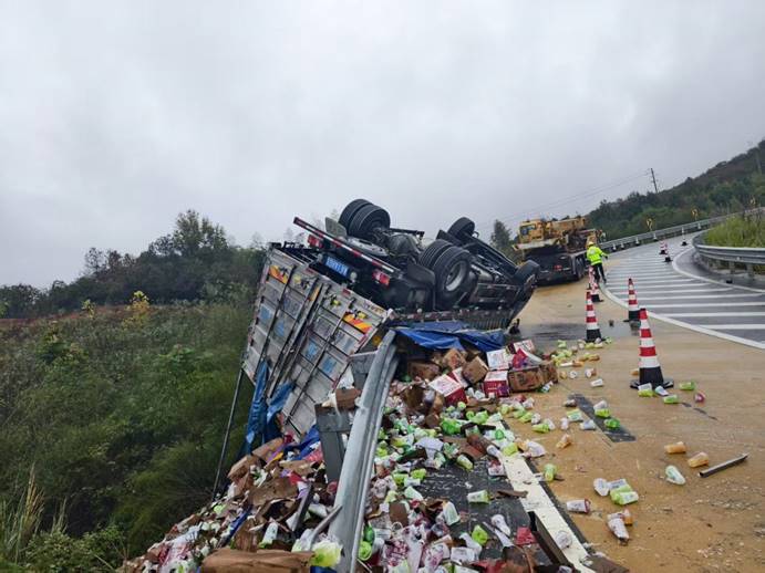 1月30日中午,高速公路执法大队二中队接到报警:一辆货车在武深高速与平益高速互通匝道发生侧翻。执法人员立即赶赴现场,迅速设置安全警示标志,疏导过往车辆,防止二次事故发生。据了解,司机苟师傅因操作不当导致车辆侧翻,车上大量货物散落在路面及边坡。