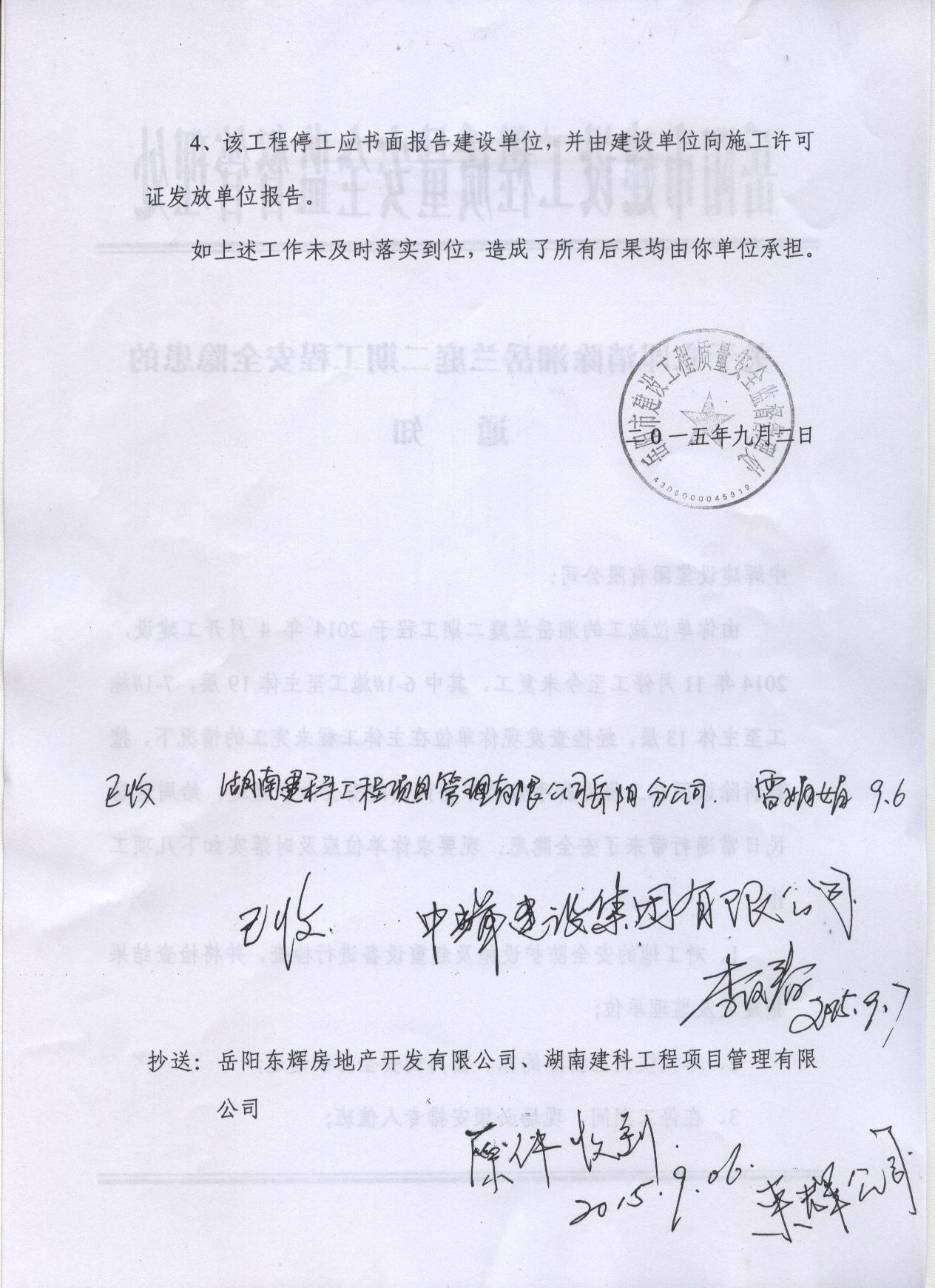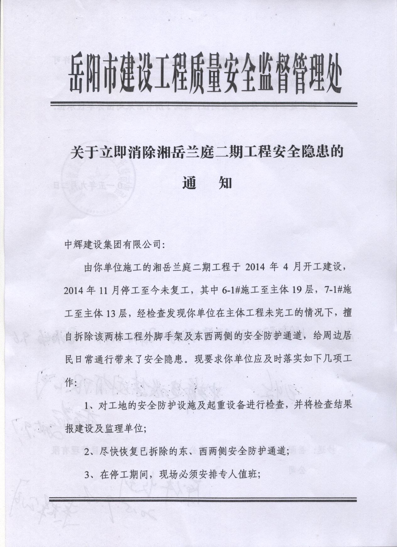 我局安排市建设工程质量安全监督处(以下简称市质安处)到现场进行了调查核实,湘岳兰庭项目6-1#施工至主体19层,7-1#施工至主体13层,施工单位现将两栋建筑物外脚手架及东西两侧的安全防护通道已全部拆除,对周边居民日常通行确实造成安全隐患。针对上述情况,市质安处约谈了建设、施工、监理单位相关负责人,并对施工单位中辉建设集团有限公司下发了《关于立即消除湘岳兰庭二期工程安全隐患的通知》,并抄送建设、监理单位,提出相关整改要求,市质安处将跟踪监督。