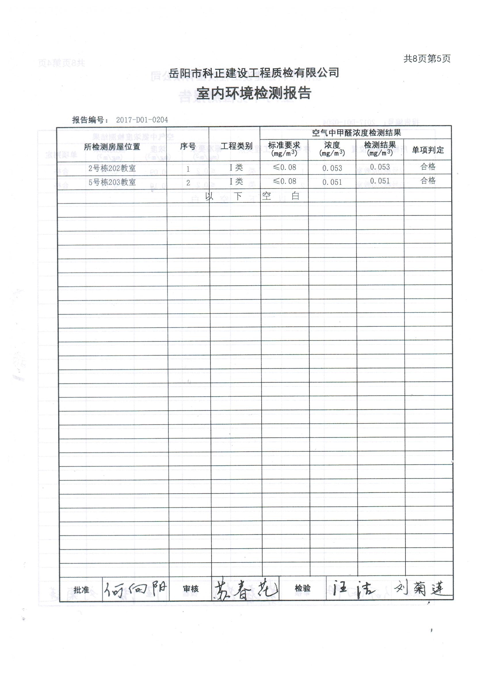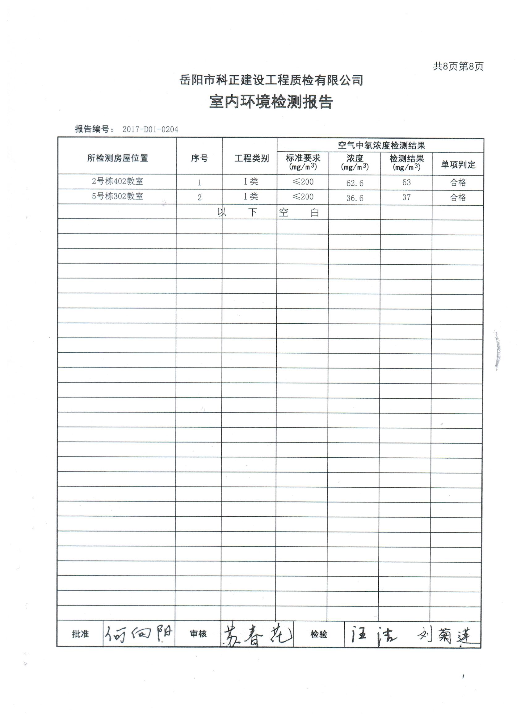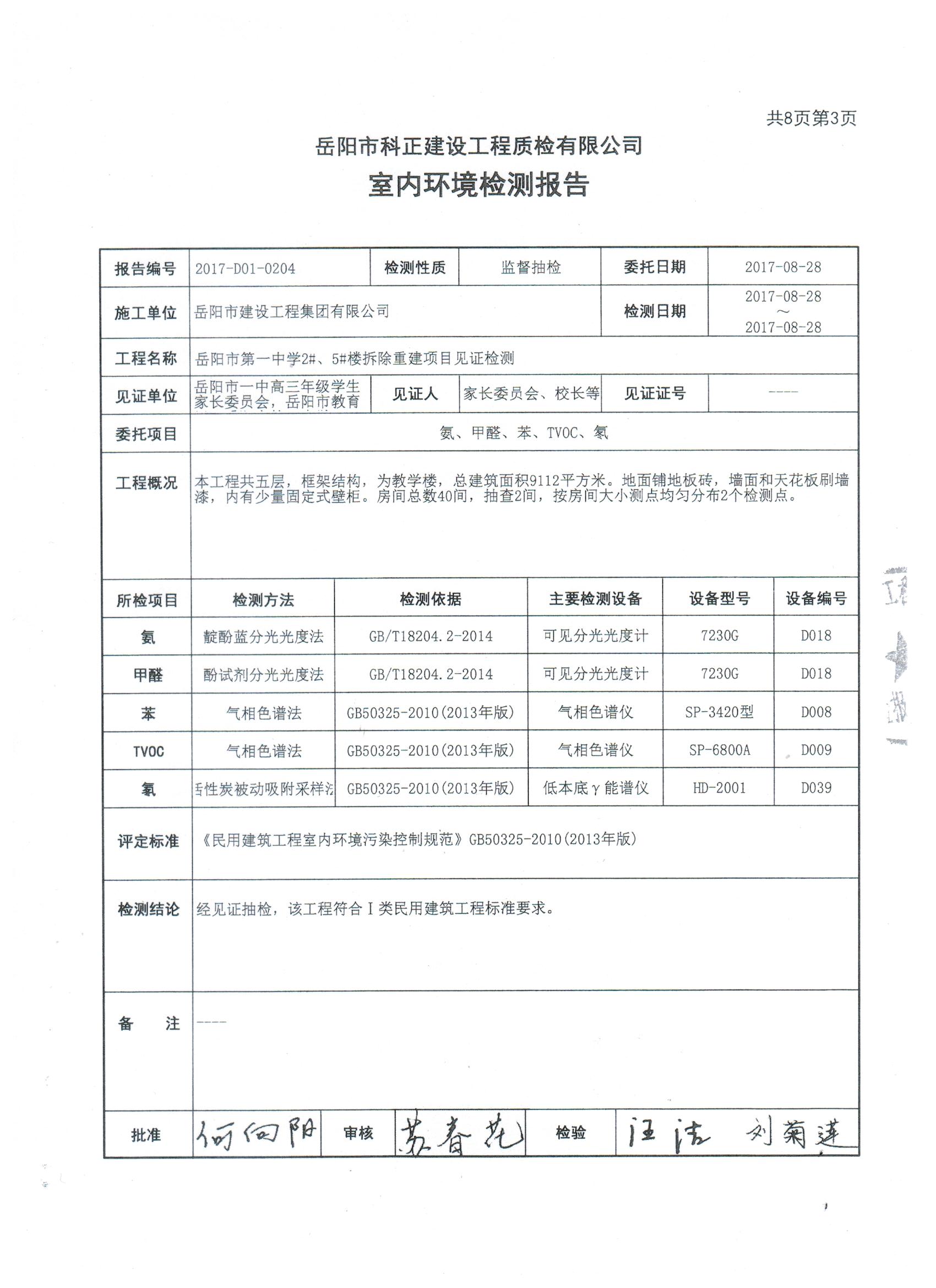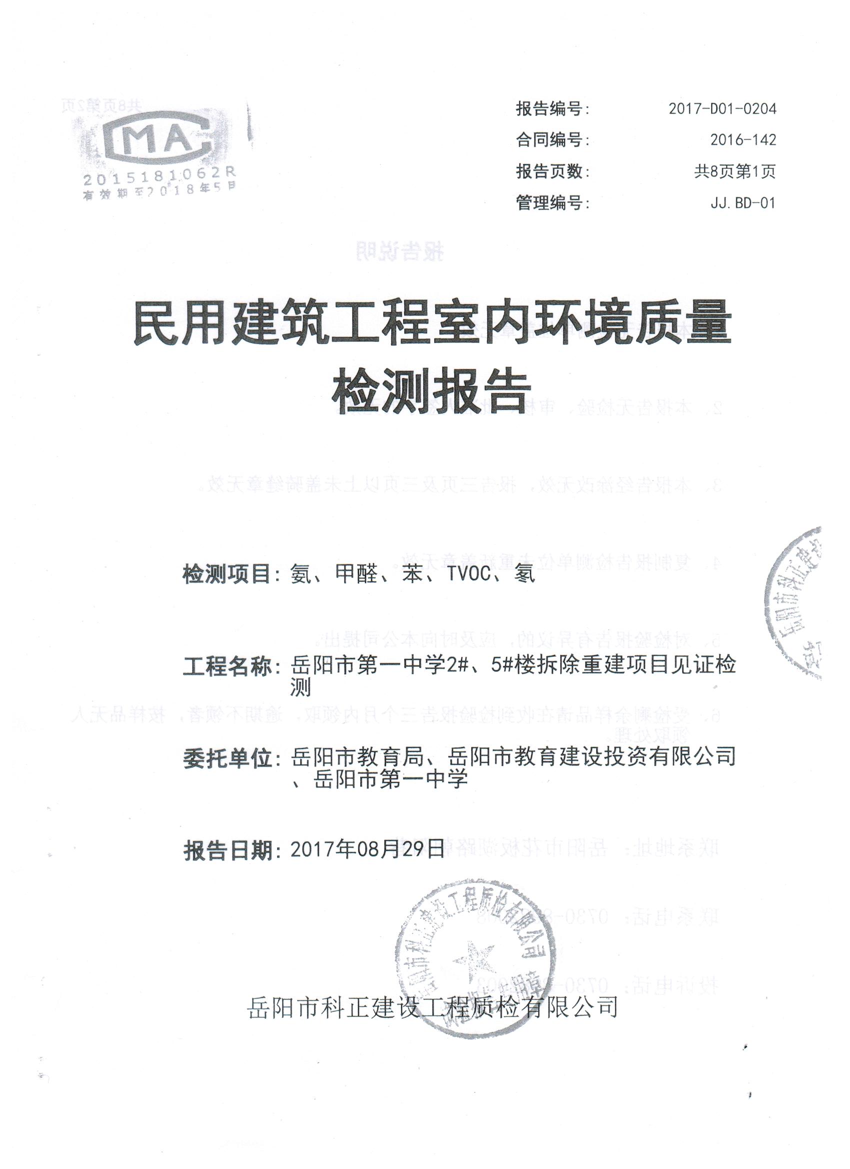 2#、5#楼拆除重建项目完工后校方组织第三方检测机构于8月7日、8月28日进行了两次室内环境检测。8月7日,岳阳市科正建设工程质检有限公司专业人员来校进行室内环境检测,检测项目有氨、甲醛、苯、TVOC、氡。该公司于8月24日出具《检查报告》,检测结果为:合格。认为该工程符合I类民用建设工程指标要求。8月28日,由岳阳市教育体育局、岳阳市教育建设投资有限公司、岳阳市第一中学三方委托岳阳市科正建设工程质检有限公司对岳阳市第一中学2#、5#楼拆除重建项目见证检测,8月29日出具《检测报告》,认定该工程符合I类民用建设工程指标要求。