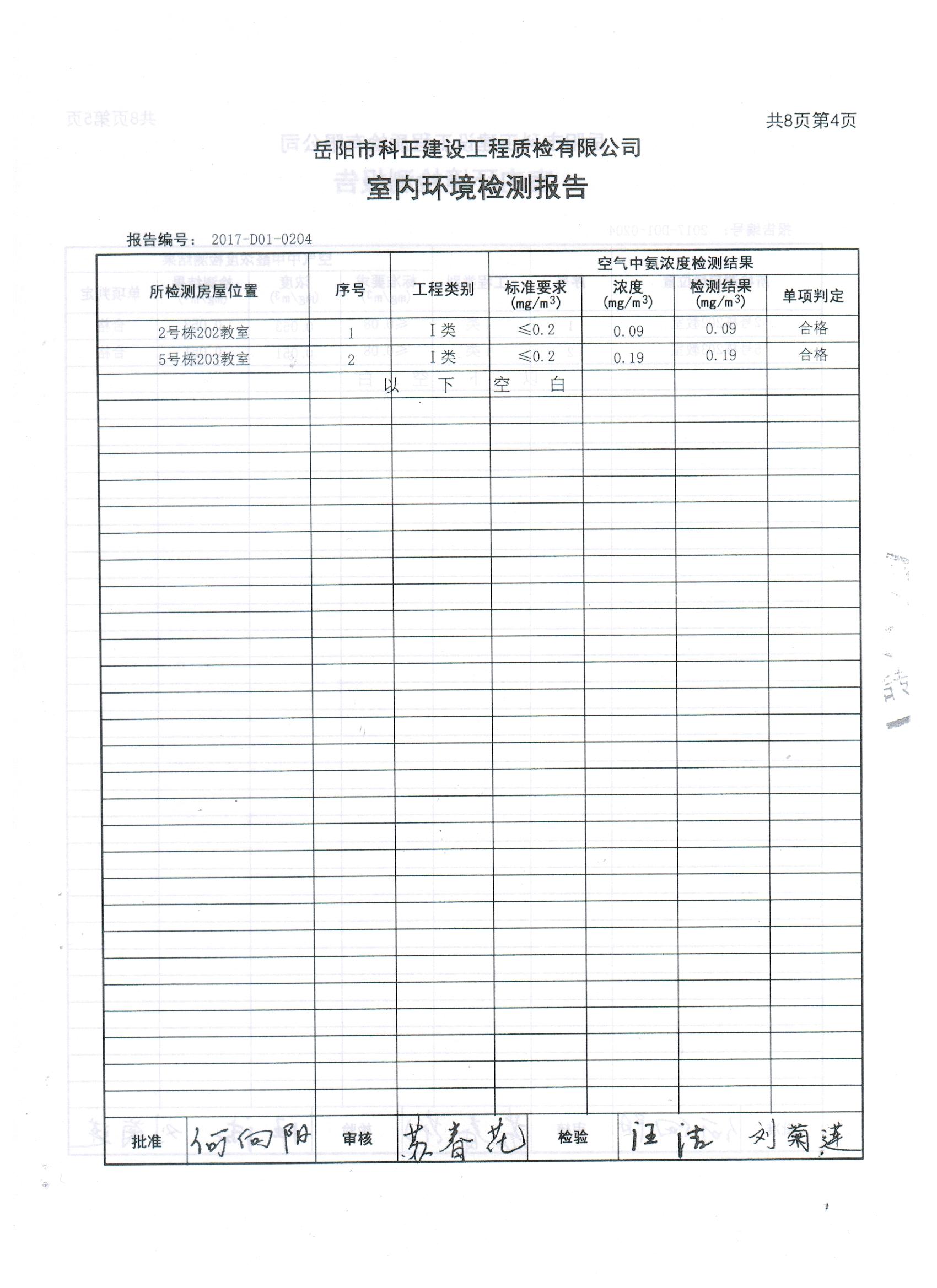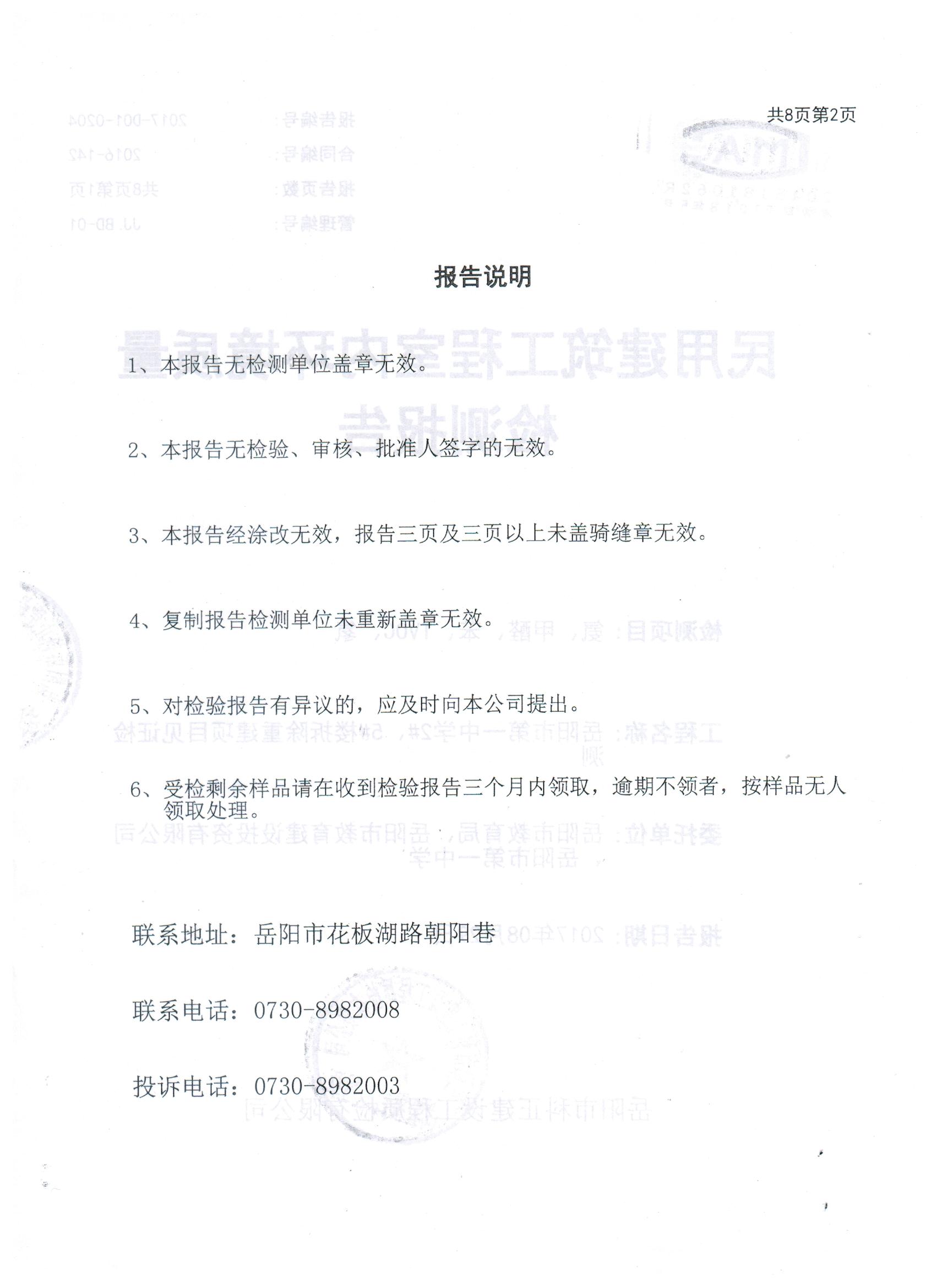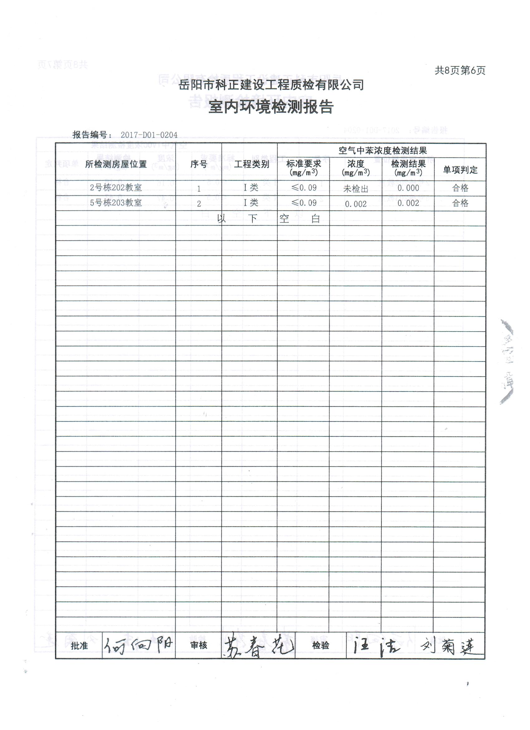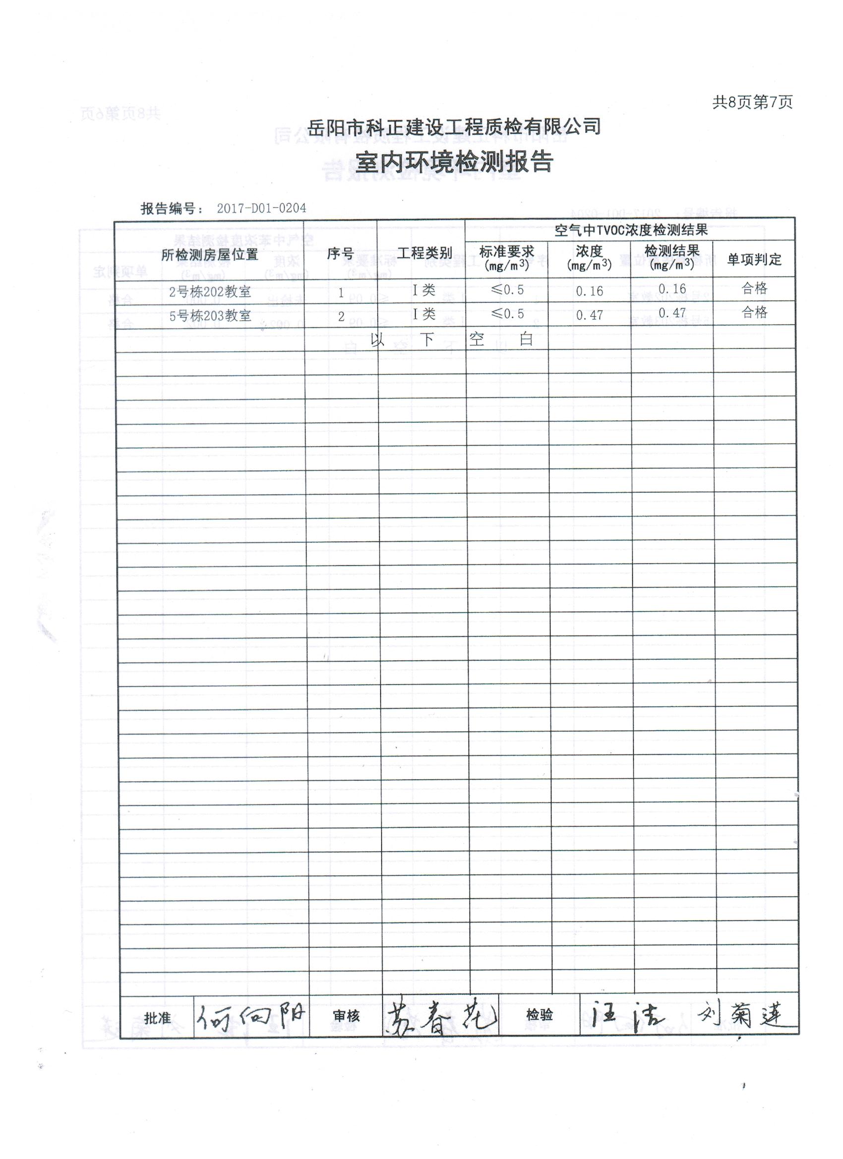 2#、5#楼拆除重建项目完工后校方组织第三方检测机构于8月7日、8月28日进行了两次室内环境检测。8月7日,岳阳市科正建设工程质检有限公司专业人员来校进行室内环境检测,检测项目有氨、甲醛、苯、TVOC、氡。该公司于8月24日出具《检查报告》,检测结果为:合格。认为该工程符合I类民用建设工程指标要求。8月28日,由岳阳市教育体育局、岳阳市教育建设投资有限公司、岳阳市第一中学三方委托岳阳市科正建设工程质检有限公司对岳阳市第一中学2#、5#楼拆除重建项目见证检测,8月29日出具《检测报告》,认定该工程符合I类民用建设工程指标要求。